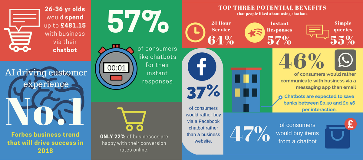 The infographic below shows some of the latest feelings and statistics on chatbots and how consumers now view conversing with businesses.